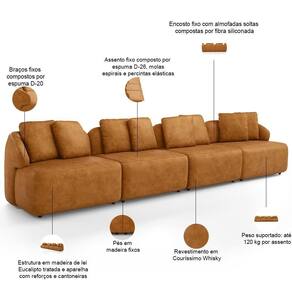 Model: Arlo | ColorSupplier: Whisky | Fabricante: Lyam Decor | Orientação do Sofá: Linear | Requer montagem: Não | Unidades por kit: 1 | Desenho do tecido: Liso | Peso: 190 kg | Tipo de produto: Sofá Modulado | Linha: Sala de Estar, Living | Peso máximo suportado: 480 kg | Color: Marrom Escuro | Mecanismo de abertura do produto: na | Formato do sofá: Orgânico | MaterialFamily: Madeira de Eucalipto | Cor dos pés: Marrom Escuro | ProductWeight: 190 kg | ColorFamily: Marrom Escuro | Cor: Whisky | Altura: 87 cm | Estilo: Moderno | OriginCountry: Brasil | ColorSimple: Marrom Escuro | Material: Madeira de Eucalipto, Cantoneiras, Chapas em MDF | Densidade da espuma do assento: D-26 | ProductContents: 01 Sofá | ProductInstructions: Produto para uso em ambiente interno, nao devendo ficar exposto ao sol, calor e umidade excessivos. | Material do estofamento: Couríssimo | ProductWarranty: 90 dias após o recebimento do produto | ProductHeight: 87 cm | Quantidade de Caixas de embalagem: 4 | Material de enchimento do encosto: Espuma Soft | ProductWidth: 394 cm | Largura: 394 cm | ProductLength: 87 cm | SizeDescription: Altura: 87 cm x Largura: 394 cm x Profundidade: 87 cm | SupplierSimpleName: Sofá 5 Lugares Para Sala de Estar Living 394cm Arlo F04 Couríssimo Whisky - Lyam Decor | OriginState: PR | Profundidade: 87 cm