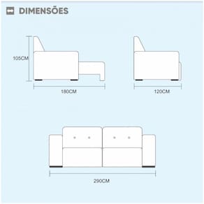 Dimensões do produto: Altura aproximada: 105 cm Largura aproximada: 120 cm Abertura aproximada: 180 cm Módulos: 120 cm Comprimento: 290 cm Braço: 25 cm Peso: 115 kg