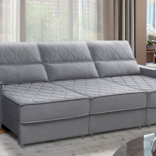 Revestido em suede macio e resistente, possui assentos retráteis e encostos reclináveis, ideais para relaxar. Sua estrutura em madeira de eucalipto com percintas elásticas suporta até 150 kg por assento. O enchimento em fibra siliconada e os pés reforçados garantem firmeza e durabilidade.