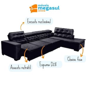 Renove com muita ousadia e elegância o seu ambiente preferido de descanso e descontração, com o Sofá 7 Lugares de Canto Retrátil e Reclinável Sttilo com Chaise 3,70 na cor PRETO, fabricado pela MegaSul, qual possui encosto reclinável, com catraca silenciosa 5 estágios, almofadas fixas de fibra siliconada, ideal para você aproveitar o seu momento de assistir seus programas de TV preferidos, ou reunir a família junto! Valorize e complete o seu lar com muita beleza e funcionalidade! Aproveite e experimente o novo!
