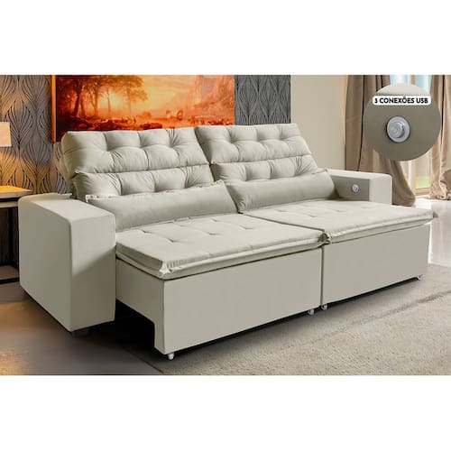 Sabe aquela sensação de felicidade e satisfação que você sente quando faz uma boa escolha?! Pois bem, essa é a sensação de comprar um sofá América com tecnologia de carregamento USB. Um produto moderno, inovador com design e Tecnologia que você merece, e ainda combina com qualquer ambiente e o deixa ainda mais lindo e aconchegante. Ele possui encosto reclinável em cinco posições, proporcionando-lhe mais conforto na hora do descanso. E não para por aí: seu assento retrátil conta com espuma D28 e molas espirais, transformando seu sofá em uma verdadeira cama para assistir seu filme preferido. Itens Inclusos: 1 Sofá Com Tecnologia de carregamento USB. Medidas do sofá: - Largura: 252cm - Altura: 102cm - Profundidade fechado: 100cm - Profundidade aberto: 140cm - Pé de tabaco:0,5 cm - Rodas de silicone Características Sofá: - Encosto Reclinável com 5 posições, almofadas fixas compostas de 100% fibra siliconada para maior conforto. - Assentos retráteis com 25cm em Espuma D28 com percintas pneumáticas e feltro para proteger do atrito. - Molas Espirais que garante ainda mais o conforto. - Braços com 25cm de largura e com espuma D23. - Fixação: Grampos galvanizados antiferrugem. - Estrutura de Madeira maciça 100% eucalipto de reflorestamento, produto ecologicamente correto. - Indicado para: Sala de Filmes, Sala de Gamer, Sala de estar, Sala de Leitura, Sala de Descanso. - Ideal para carregar: Celular, Controle Gamer, Fone Gamer, e outros dispositivos eletrônicos que utilizam USB. Informações técnicas do USB: - Quantidade de entradas: 3 Unidade; - Voltagem: Bivolt (127 – 220 Volts); - Input: 100-240VAC; - 50/60Hz - 0.6ª - O/P: DC12V - 2000mA Informações Complementares: - Suporte até 120kg por assento; - Montagem Simples; - 3 Meses de garantia; - 2 Módulos. Informações importantes: – Os objetos que ambientam as fotos não acompanham o produto. – Tonalidade de cores pode sofrer variação conforme monitor visualizador. – Os tecidos podem sofrer alterações de tonalidades dependendo do lote de produção. – Verifique as dimensões do produto e certifique-se que o percurso que ele fará até o local de uso permite sua passagem. – Quaisquer despesas ou danos no transporte até o local de uso ficam a cargo do cliente. – Em situação de escadaria ou Elevadores - Entregadores efetua apenas na portaria.