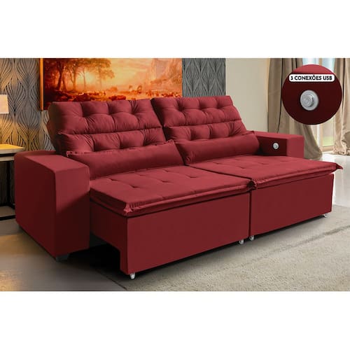Sofá América 2,52 m 3 Lugares Tecnologia Carregamento 3 portas USB Retrátil e Reclinável - WS ESTOFADOS - Vermelho
