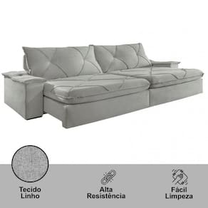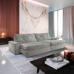 O encosto reclinavel em ate 90, proporciona a flexibilidade ideal para os seus momentos de descanso. As almofadas, preenchidas com fibras siliconadas, nao apenas suportam, mas envolvem voce em um abraco reconfortante.