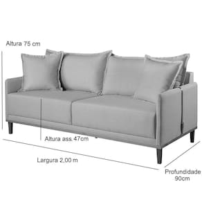 Altura 90 cm Profundidade 90 cm Profundidade do assento sem almofadas 70 cm Profundidade do assento com almofadas 55 cm Largura 2 m Quantidade de lugares 3 Peso suportado por assento 140 kg Tecido Linho Material da Estrutura Eucalipto tratado anti cupim Assento molas espirais, percintas elásticas, espuma D28 soft (qualidade contínua 10cm espessura) Tipo do Encosto almofadas soltas com fibra siliconada Base