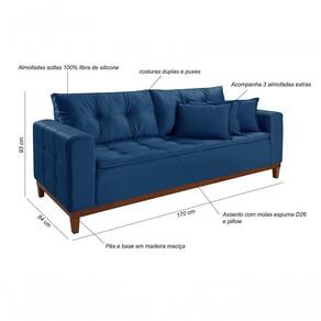 Sofá 3 Lugares Atenas 1,70 Pés e Base em Madeira (Acompanha 3 almofadas) O Sofá Atenas irá transformar sua sala em um ambiente de conforto e bem estar, acomodando até três pessoas sentadas. Desenvolvido com madeira maciça, seu revestimento é de Veludo que tem um toque macio e confortável, almofadas soltas 100% fibras siliconadas, seu assento possui molas, percintas e pillow, espuma D-26 de alta qualidade que fazem deste produto ser ainda mais aconchegante e confortável. Com detalhes que chamam atenção, o sofá Atenas tem costura duplas, no assento, encosto e nos braços que agrega elegância e estilo ao produto. Descrição do Produto:
