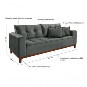 Sofá 3 Lugares Atenas 2,00 Pés e Base em Madeira (Acompanha 3 almofadas) O Sofá Atenas irá transformar sua sala em um ambiente de conforto e bem estar, acomodando até três pessoas sentadas. Desenvolvido com madeira maciça, seu revestimento é de Veludo que tem um toque macio e confortável, almofadas soltas 100% fibras siliconadas, seu assento possui molas, percintas e pillow, espuma D-26 de alta qualidade que fazem deste produto ser ainda mais aconchegante e confortável. Com detalhes que chamam atenção, o sofá Atenas tem costura duplas, no assento, encosto e nos braços que agrega elegância e estilo ao produto. Descrição do Produto: