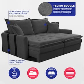 Leve conforto e elegância para sua sala com o Sofá Baú Sem Caixa 1,60m Retrátil Bonnie Boucle. Este modelo é ideal para transformar seu ambiente com estilo, oferecendo uma experiência de descanso inigualável graças à tecnologia de Espuma SoftGel D40 com ThermoGel. Funcional e versátil, este sofá 3 em 1 se transforma em uma cama de casal e também em um incrível sofá, que inclui um espaçoso compartimento baú para organizar suas decorações e objetos.