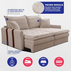 Leve conforto e elegância para sua sala com o Sofá Baú Sem Caixa 1,60m Retrátil Bonnie Boucle. Este modelo é ideal para transformar seu ambiente com estilo, oferecendo uma experiência de descanso inigualável graças à tecnologia de Espuma SoftGel D40 com ThermoGel. Funcional e versátil, este sofá 3 em 1 se transforma em uma cama de casal e também em um incrível sofá, que inclui um espaçoso compartimento baú para organizar suas decorações e objetos.