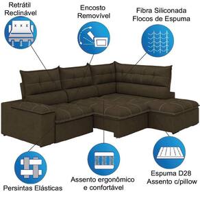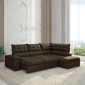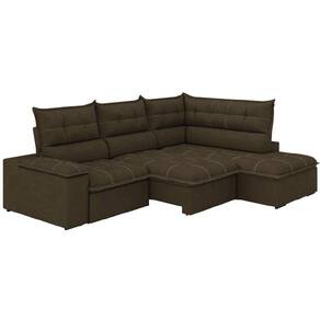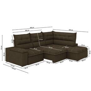 MEDIDAS 2 LUGARES:: [ A ] = 113 cm [ L ] = 220 cm [ P ] = 100 cm | MEDIDAS 3 LUGARES:: [ A ] = 113 cm [ L ] = 300 cm [ P ] = 114 cm / 170 cm (Aberto) | MEDIDA DOS PÉS:: 10 cm | PESO:: 131,8 kg | SUPORTA POR ASSENTO ATÉ:: 120 kg | MODELO:: Sofá de Canto Bipartido Retrátil e Reclinável 5 Lugares Veludo Fofão | MARCA:: Luizzi | COR:: Marrom | TIPO DE SOFÁ:: Retrátil e reclinável | TECIDO:: Veludo | MATERIAL ASSENTO:: Espuma (D28) com pillow proporcionando maior conforto | MATERIAL ENCOSTO:: Fibra e flocos | MOLAS:: Sim, Espirais | MATERIAL PÉS:: PVC | QUANTIDADE DE PÉS:: 8 | PERCINTAS:: Elásticas | RODÍZIOS:: Sim | ENCOSTO:: Removível | QUANTIDADE DE LUGARES:: 5 | MATERIAL DA ESTRUTURA:: Madeira (Eucalipto/OSB) | DIFERENCIAL:: Assentos retráteis, encostos reclináveis e removíveis para ajuste personalizado de conforto | GARANTIA:: 3 meses | AVISO:: A Esplanada Móveis se responsabiliza pela dos produtos adquiridos até a porta de entrada ou portaria do endereço indicado, se a portaria do condomínio permitir, as s são efetuadas no piso térreo e é de responsabilidade do cliente. | TIPO DE PRODUTO: SOFÁ