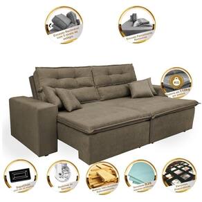 Sofá Cairo 1,82m Retrátil, Reclinável Tecido Suede Castor Procurando um estofado amplo, confortável, bonito e que combine com seu ambiente? Conheça o Sofá Cairo. Seus Assentos retráteis são compostos por espuma D28 e Pillow com manta em fibra de silicone, proporcionando muito conforto. Seus encostos reclináveis em 5 estágios possuem fibra siliconada e flocos de espuma. Sua estrutura é desenvolvida em madeira de eucalipto de reflorestamento o que proporciona maior segurança e qualidade ao sofá cairo. Desfrutar de um bom filme em sua sala não será mais como antes... Características: - Encosto: Reclinável em fibra de silicone / Flocos de espuma - Assentos: Assento Retrátil com percintas tipo Italiana, Pillow composto por espumas progressivas, manta de 5cm espuma de poliuretano d28 + manta de 05cm de espuma híper soft d28 + manta acrílica siliconada, tudo isso para oferecer um conforto inigualável! - Braços em espuma D23 - Acompanha 4 lindas Almofadas que combinam perfeitamente com seu designer compostas por fibra de silicone e flocos de espuma revestidas com o mesmo tecido do estofado. - Fixação: Grampos galvanizados - Estrutura desenvolvida em madeira de eucalipto e pinus - Suporta até 110kg por pessoa