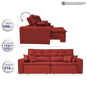 Características: - Encosto: Reclinável em fibra de silicone / Flocos de espuma - Assentos: Assento Retrátil com percintas tipo Italiana, Pillow composto por espumas progressivas, manta de 5cm espuma de poliuretano d28 + manta de 05cm de espuma híper soft d28 + manta acrílica siliconada, tudo isso para oferecer um conforto inigualável! - Braços em espuma D23 - Acompanha 4 lindas Almofadas que combinam perfeitamente com seu designer compostas por fibra de silicone e flocos de espuma revestidas com o mesmo tecido do estofado. - Fixação: Grampos galvanizados - Estrutura desenvolvida em madeira de eucalipto e pinus - Suporta até 110kg por pessoa