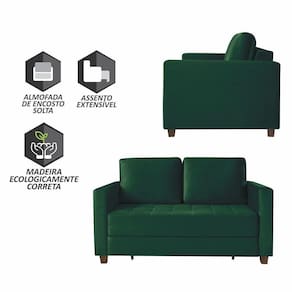 Características: - Estrutura de madeira de reflorestamento, seca e imunizada; - Espumas utilizadas de fabricação própria; - Encosto - Fixo com espuma D28, almofadas soltas preenchidas 100 com fibra siliconada e revestida com manta siliconada fina; - Assento - Extensível, com espuma D28 revestida com manta de espeuma D28 soft e manta siliconada; - Extrado de madeira de eucalipto envernizada; - Revestimento - Tecido Veludo Paris - Pés de madeira de excelente qualidade com acabamento em verniz.