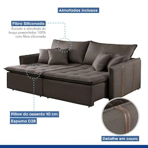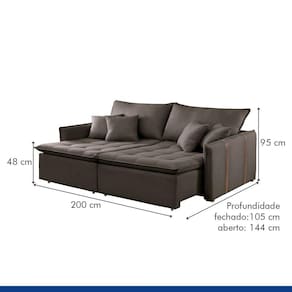 Deixar sua casa aconchegante e receptiva nunca foi tão fácil: é só contar com o Sofá Detroid! Com estrutura resistente feita em madeira reflorestada, ele oferece a estabilidade e a firmeza ideais para o uso contínuo, enquanto o encosto com enchimento, o assento estofado em espuma e o revestimento levam aquela sensação boa de acolhimento e bem-estar. O modelo ainda é do tipo retrátil, ou seja, é ideal tanto para aquela conversa com os amigos quanto para esticar as pernas depois de um dia corrido e relaxar. Além de todos esses benefícios, o visual sóbrio dão um ar elegante ao lar-style, enquanto cria um ponto de destaque na sala de estar. Sua família e amigos se sentirão sempre muito à vontade no seu doce lar ;) Acompanha Almofadas extras: Não Almofada do assento: Fixa Almofada do encosto: Removível Altura do assento até o chão: 48 Altura do Encosto: 47 Altura dos Pés: 2.5 Ambiente Principal: Sala de Estar Complexidade da Montagem: Baixa: pode ser montado por uma pessoa sozinha Cor: Marrom Cor do Produto: Marrom Densidade do Assento: D-28 Densidade do Encosto: D-18 Enchimento do Assento: Espuma Enchimento do Braço: Espuma D-28 Enchimento do Encosto: Fibra Siliconada Estilo de Braço: Braços Quadrados Firmeza do Assento: Firme Informações Complementares: Pillow Dos Assentos Com 10Cm De Altura, Assentos Com Espuma D28 Supersoft, Assentos Retratil Com Tubo Metálico, Mais Mola Bonnel, Encostos Reclináveis Em 7 Posições Diferentes, Madeira De Eucalipto Reflorestada, Ecologicamente Correto, Rodinhas De Silicon Itens Inclusos: 1 Sofá e 1 Manual de Instrução. Material dos Pés: Madeira de Eucalipto Medida como Cama (A x L x P): 95cmx200x144cm Modelo: Retrátil e Reclinável Necessita Montagem: Sim Origem do Produto: Nacional Peso: 71.7 Pet Friendly: Não Possui Baú: Não Possui Percintas Elásticas: Sim Possui Pés: 08 Possui Rodízio: Sim Profundidade Quando Estendido: 144 Reclinável: Sim Recomendações de Uso, Manutenção e Limpeza: Não utilizar produtos químicos. Não utilizar produtos abrasivos. Não molhar. Utilizar pano macio e seco ou levemente umedecido. Revestimento do Assento: Veludo Revestimento do Braço: Veludo Revestimento do Encosto: Veludo Rodízio com Trava: Não Sistema de Montagem: Encaixe Tecido Predominante: Veludo Tipo de Assento: Regulável Tipo de Encosto: Regulável Tipo de Mola: Molas Bonnel Ean: 7909903390382