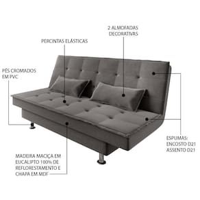 MODELO:: 5031 | MARCA:: Mamflex | COR:: Cinza Veludo Suede | MEDIDA TOTAL DO SOFÁ:: [ A ] = 95 cm / 47 cm (aberto) [ L ] = 184 cm [ P ] = 92 cm / 118 cm (aberto) | TECIDO:: Veludo Suede | PERCINTAS:: Elásticas Italiana | MATERIAL DA ESTRUTURA:: Madeira Eucalipto | MATERIAL DO ASSENTO / ENCOSTO:: Espuma | DENSIDADE DE ESPUMA:: D21 | QUANTIDADE DE LUGARES:: 3 | TIPO DE SOFÁ:: Sofá - Cama | PÉS:: 4 | MATERIAL DOS PÉS:: PVC Cromados | QUANTO SUPORTA POR ASSENTO:: 110 kg por assento | PESO:: 38 kg | GARANTIA:: 3 Meses | AVISO:: A Esplanada Móveis se responsabiliza pela dos produtos adquiridos até a porta de entrada ou portaria do endereço, se a portaria do condomínio permitir, as s são efetuadas no piso térreo sendo de responsabilidade do cliente a locomoção | TIPO DE PRODUTO: Sofá - Cama Cor: Cinza