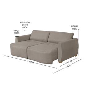 A verdadeira genialidade do ITALIA reside em sua versatilidade. Com dimensões que o tornam adequado tanto para salas de estar amplas quanto para espaços mais compactos, este estofado se adapta a qualquer dinâmica. Sua capacidade de se transformar em um aconchegante sofá-cama eleva seu valor prático, solucionando a necessidade de acomodar hóspedes. Produto Montado: Sim Acompanha Almofadas extras: Não Almofada do assento: Fixa Almofada do encosto: Fixa Altura do assento até o chão: 46.0000 Altura do Braço: 65 cm Altura do Encosto: 42 cm Altura dos Pés: 4 cm Altura Máxima dos Pés: 4.0000 Ambiente Principal: Sala de Estar codigo_ean: 7900288272935 Complexidade da Montagem: Média: pode ser montado por mais de uma pessoa e/ou necessite de maior conhecimento para montagem Consistência do Assento: Macio Cor: Bege Cor do Produto: Bege Densidade do Assento: D-28 Enchimento do Assento: Espuma Enchimento do Braço: Espuma D-23 Estilo de Braço: Braços Redondos Firmeza do Assento: Macio Itens Inclusos: 1 Sofá e Kit Montagem Largura do Braço: 16 cm Largura Total: 232 cm Linha ou Coleção: Italia Manual de Especificação Técnica: https://product-hub-prd.madeiramadeira.com.br/673180627/documents/9ec70b3f-15fd-442d-8c11-9977755c3cd23290400579917612375007442.pdf Manual de Montagem e Instalação: https://product-hub-prd.madeiramadeira.com.br/673180627/documents/7eac65c0-7577-48bd-81da-1c67ac4d5ba63290399579917612374968526.pdf Marca: Konfort King Material da Corrediça do Sofá: Aço/Metal Material dos Pés: Madeira Medida como Cama (A x L x P): 88x232x111 Modelo: Retrátil e Reclinável Necessita Montagem: Sim Nível de Conforto: Macio Origem do Produto: Nacional Peso: 85,6 kg Peso Suportado por m²: 120 kg/m² Pet Friendly: Não Possui Baú: Não Possui Mola: Sim Possui Percintas Elásticas: Sim Possui Pés: 08 Possui Rodízio: Sim Profundidade Quando Estendido: 143 cm Reclinável: Sim Recomendações de Uso, Manutenção e Limpeza: Não Utilize produtos químicos, nem aparelhos a vapor ou secador quente Revestimento do Assento: Linho Revestimento do Braço: Linho Revestimento do Encosto: Linho Sistema de Montagem: kit montagem Tecido Predominante: Linho Tipo de Assento: Regulável Tipo de Encosto: Regulável Tipo de Mola: Molas Bonnel Tipo de Sofá: Sofá Cama Marca: Não Informado