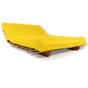 Material e estrutura: O colchão futon casal é fabricado em tecido de alta qualidade em sarja peletizada 100% algodão, seu enchimento é de mantas de algodão natural, manta fibra siliconada estruturado por espuma ortopédica D28. Possui amarras nas extremidades, a estrutura é produzida em madeira maciça de grápia natural.