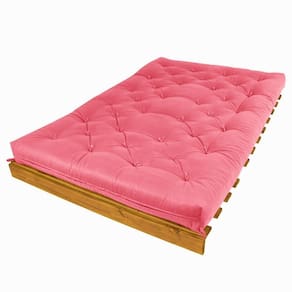 Colchão futon casalEnchimento de mantas de algodão natural e manta de fibra siliconadaEstrutura de espuma ortopédica D28Amarras nas extremidadesBase de madeira maciça