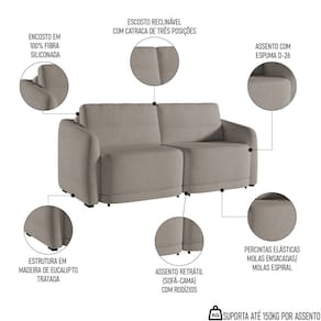 Características do Produto Material da estrutura: Madeira de Eucalipto Tratada. Material do Assento: Espuma D-26. Material do Encosto: 100% Fibra Siliconada. Revestimento: Bouclê. Peso Suportado: 150 kg por assento. Quantidade de Assentos: 2 Assentos. Quantidade de Lugares: 2 Lugares. Tipo de Encosto: Reclinável com Catraca 3 Posições. Tipo de Assento: Retrátil. Possui Pés: Sim. Possui Rodízios: Sim. É sofá-cama: Sim. Diferenciais: - Design moderno. - Sofá cama modular. - Acompanha almofadas. - Assento com percintas elásticas, molas ensacadas e molas espiral. Sistema de Montagem: O produto é enviado montado, sendo necessário apenas a junção dos módulos. Manual de Montagem: Não. Volumes: 2 Volumes. Conteúdo da Embalagem: 1 Sofá Cama. Garantia do Fabricante: 90 dias contra defeito de fabricação. Montagem: Recomendamos que seja feita por um profissional. Recomendação de Limpeza: Utilize pano levemente úmido.