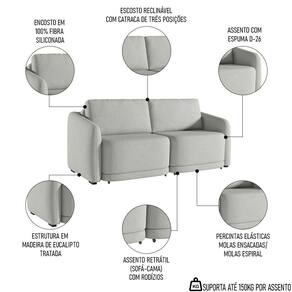 Características do Produto Material da estrutura: Madeira de Eucalipto Tratada. Material do Assento: Espuma D-26. Material do Encosto: 100% Fibra Siliconada. Revestimento: Linho. Peso Suportado: 150 kg por assento. Quantidade de Assentos: 2 Assentos. Quantidade de Lugares: 2 Lugares. Tipo de Encosto: Reclinável com Catraca 3 Posições. Tipo de Assento: Retrátil. Possui Pés: Sim. Possui Rodízios: Sim. É sofá-cama: Sim. Diferenciais: - Design moderno. - Sofá cama modular. - Acompanha almofadas. - Assento com percintas elásticas, molas ensacadas e molas espiral. Sistema de Montagem: O produto é enviado montado, sendo necessário apenas a junção dos módulos. Manual de Montagem: Não. Volumes: 2 Volumes. Conteúdo da Embalagem: 1 Sofá Cama. Garantia do Fabricante: 90 dias contra defeito de fabricação. Montagem: Recomendamos que seja feita por um profissional. Recomendação de Limpeza: Utilize pano levemente úmido.
