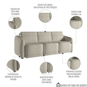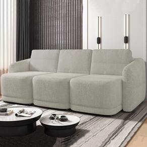 Características do Produto Material da estrutura: Madeira de Eucalipto Tratada. Material do Assento: Espuma D-26. Material do Encosto: 100% Fibra Siliconada. Revestimento: Bouclê. Peso Suportado: 150 kg por assento. Quantidade de Assentos: 3 Assentos. Quantidade de Lugares: 3 Lugares. Tipo de Encosto: Reclinável com Catraca 3 Posições. Tipo de Assento: Retrátil. Possui Pés: Sim. Possui Rodízios: Sim. É sofá-cama: Sim. Diferenciais: - Design moderno. - Sofá cama modular. - Acompanha almofadas. - Assento com percintas elásticas, molas ensacadas e molas espiral. Sistema de Montagem: O produto é enviado montado, sendo necessário apenas a junção dos módulos. Manual de Montagem: Não. Volumes: 3 Volumes. Conteúdo da Embalagem: 1 Sofá Cama. Garantia do Fabricante: 90 dias contra defeito de fabricação. Montagem: Recomendamos que seja feita por um profissional. Recomendação de Limpeza: Utilize pano levemente úmido.