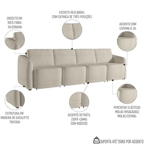 Essa peça impressionante foi projetada para trazer conforto e estilo ao seu espaço, principalmente com o recurso retrátil, em que você pode ajustar facilmente o sofá para atender às suas necessidades de assento, além de aproveitá-lo como cama e acomodar perfeitamente as suas visitas. Isso porque, a espuma D26 garante o máximo de conforto, enquanto o revestimento de alto padrão acrescenta um toque de elegância. Seja para assistir a um filme ou para receber convidados, esse sofá 4 lugares será o complemento perfeito para a sua sala de estar.