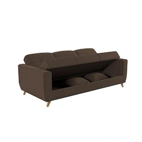 O grande diferencial é o baú embutido sob o assento, perfeito para guardar roupas de cama, travesseiros ou objetos pessoais, mantendo o ambiente sempre organizado. Os pés de madeira completam o visual sofisticado e moderno do sofá-cama.