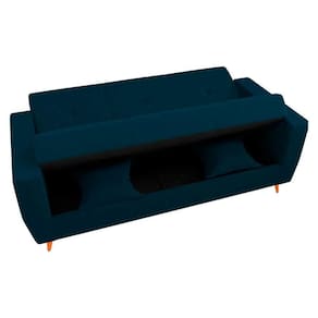 O grande diferencial é o baú embutido sob o assento, perfeito para guardar roupas de cama, travesseiros ou objetos pessoais, mantendo o ambiente sempre organizado. Os pés de madeira completam o visual sofisticado e moderno do sofá-cama.