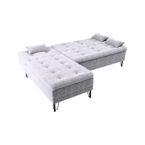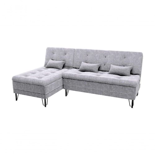 sofá cama nice c/ chaise oferece o diferencial de abertura por catraca,mecanismo de movimento e fixação assento/encosto, de fácil manuseio, prático e design moderno. dispõe de 03 posições (sentado, leitura e descanso). este sofá é produzido com madeira de reflorestamento, possui sistema de molas espirais e espuma de ótima, qualidade, pode acomodar até três pessoas como sofá e duas como cama, acompanha três, almofadas. suporta até 110 kg por assento.