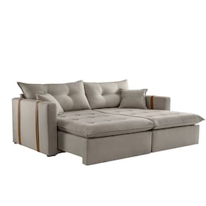 Características: Tipo: Sofá 5 lugares Cama, Retrátil e Reclinável Marca: TXR Modelo: Lisboa Estrutura: Madeira de origem certificada, Eucalipto Revestimento: Em tecido Veludo Bege Pés: Em madeira reflorestada Assento: Retrátil de duplo molejo - mola Bonnel + percinta tipo Italiana + Pillow de molas ensacadas com espuma D28 Encosto: Reclinável em 3 estágios. Braços: 10 cm. Retrátil e Reclinável: Com mecanismo em aço