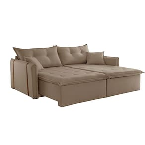 Características Marca: TXR Modelo: SP Tipo: Sofá 3 lugares Cama, Retrátil e Reclinável Estrutura: Madeira de origem certificada, Eucalipto Revestimento: Em tecido Veludo Bege Pés: Em madeira reflorestada Encosto: Reclinável em 3 estágios. Braços: 12,5 cm Retrátil e Reclinável: Com mecanismo em aço Assento: Retrátil - mola Bonnel + percinta tipo Italiana + Pillow com espuma D28