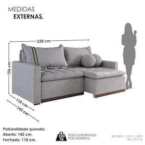 Ao estender o assento, transforma-se em um sofá-cama amplo e confortável, perfeito para hóspedes e descanso prolongado. Produto Montado: Sim Acompanha Almofadas extras: 02 Almofada do assento: Fixa Almofada do encosto: Removível Altura do assento até o chão: 50.0000 Altura do Braço: 64 cm Altura do Encosto: 60 cm Altura dos Pés: 5 cm Altura Máxima dos Pés: 5.0000 Ambiente Principal: Sala de Estar codigo_ean: 7900288229984 Complexidade da Montagem: Baixa: pode ser montado por uma pessoa sozinha Cor: Cinza Claro Cor do Produto: Cinza Claro Densidade do Assento: D-28 Enchimento do Assento: Espuma Enchimento do Braço: Espuma D-23 Enchimento do Encosto: Fibra Siliconada Estilo de Braço: Braços Quadrados Firmeza do Assento: Médio Itens Inclusos: 1 Sófa, 2 Almofadas e Kit Ferragem Largura do Braço: 10 cm Largura Total: 210 cm Linha ou Coleção: Flórida Manual de Montagem e Instalação: https://product-hub-prd.madeiramadeira.com.br/320057272/documents/78e1e93b-19c9-47e4-be5a-e6229b348f103197228596417576101315921.pdf Marca: Conceito Estofados Material da Corrediça do Sofá: Madeira Material dos Pés: Madeira Medida como Cama (A x L x P): 50x200x140 Modelo: Retrátil e Reclinável Necessita Montagem: Sim Nível de Conforto: Intermediário Origem do Produto: Nacional Peso: 94 kg Pet Friendly: Não Possui Baú: Não Possui Percintas Elásticas: Sim Possui Pés: 05 Possui Rodízio: Sim Profundidade Quando Estendido: 142 cm Profundidade quando extendido: 142.0000 Reclinável: Sim Recomendações de Uso, Manutenção e Limpeza: Limpar com pano seco ou levemente úmido com água, apenas. Revestimento do Braço: Linho Sistema de Montagem: Parafusos e encaixes Tecido Predominante: Linho Tipo de Assento: Fixo Tipo de Mola: Molas Bonnel Tipo de Sofá: Sofá Cama Marca: Não Informado
