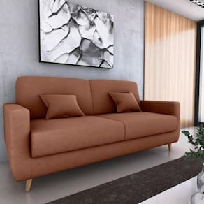 O Sofá Cama Emília oferece o diferencial de abertura com sistema de catraca de três pinos, dispondo de 3 posições (sentado, leitura e descanso). Este Sofá é produzido com madeira de reflorestamento e para dar mais flexibilidade e resistência são usadas percintas elásticas, e espuma de ótima qualidade, acomoda até três pessoas como sofá e duas como cama, acompanha duas almofadas.
