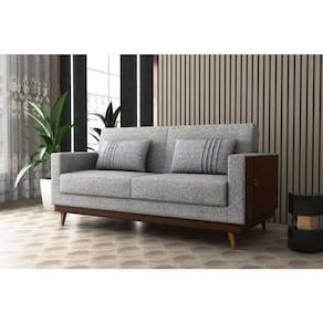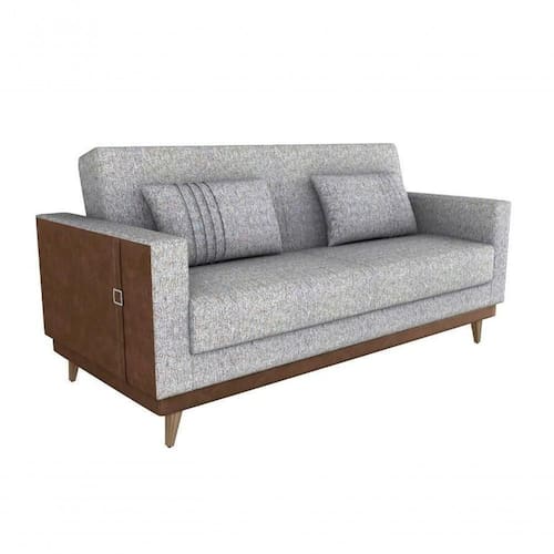 Sofá Cama Esther é composto: espuma: D23 assento e braças, D20 encosto madeira: eucalipto de reflorestamento percinta: cinta elástica + molas espirais. composição dos pés: 4 pés madeira, fixação: grampos e parafusos composição da embalagem: malha, plástico e papelão, abertura: catraca, apresentação: 2 almofadas 55x35 (cada) garantia: 90 dias de fábrica, abertura: catraca individual