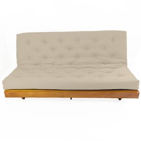Material e estrutura: O colchão futon casal é fabricado em tecido de alta qualidade em Sarja Peletizada, seu enchimento é de mantas de algodão natural, manta de fibra siliconada estruturado por espuma ortopédica D28, possui amarras nas extremidades, para melhor fixação do futon. A estrutura é produzida em madeira nobre maciça de grápia, com pintura natural.