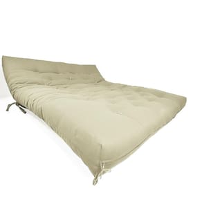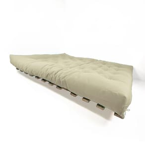 Material e estrutura: O colchão futon king é fabricado em tecido de alta qualidade em sarja peletizada 100% algodão, seu enchimento é de mantas de algodão natural, manta fibra siliconada estruturado por espuma ortopédica D28. Possui amarras nas extremidades, a estrutura é produzida em madeira maciça de pinus sem pintura.