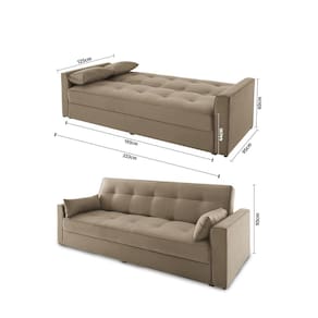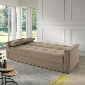 Assentos com espuma flexível de poliuretano densidade 26kg/m, certificada, fabricação própria, utilização de feltro como camada isolante, sustentados por percinta elástica e mola espiral. Com assento fixo e encosto com 3 estagio de declínio ele deita totalmente virando uma cama . Enchimento do encosto: espuma D-26 e fibra de poliéster siliconada. Estrutura de madeira maciça de pinus e eucalipto 100% reflorestada. Fixação da estrutura: grampos galvanizados anti-ferrugem. Apoiados no chão com sapatas de pvc. Revestimento/tecido: suede 100% poliéster, com toque macio.