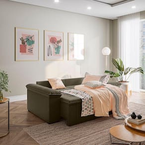 O Sofá Cama Palmeira MadeiraMadeira é a solução perfeita para quem tem pouco espaço disponível. Com ele você poderá acomodar suas visitas com conforto e praticidade. Produzido em madeira maciça de eucalipto, com as seguintes medidas (A x L x P): 103cm x 200cm x 112cm e suporta até 400kg. Depois nos conte como foi a experiência de compra e como ficou seu ambiente nos comentários! Produto Montado: Sim Altura do assento até o chão: 48.0000 Ambiente Principal: Sala de Estar codigo_ean: 7909903193105 Complexidade da Montagem: Baixa: pode ser montado por uma pessoa sozinha Cor: Grafite Enchimento do Encosto: Fibra Siliconada Estilo de Braço: Braços Pillow Top Manual de Montagem e Instalação: https://product-hub-prd.madeiramadeira.com.br/814319/documents/3ce5a7c2-2cd3-4184-b012-9d2461514c008aef38226ManualSofPalmeira.pdf Material dos Pés: Plástico Modelo: Sofá Bipartido Necessita Montagem: Sim Origem do Produto: Nacional Pet Friendly: Não Possui Baú: Não Possui Rodízio: Sim Profundidade Quando Estendido: 148 Recomendações de Uso, Manutenção e Limpeza: Evitar exposição direta à luz solar, limpar com escova macia e aspirar o pó semanalmente, não utilizar produtos químicos, removedores, alvejantes, etc. Evite exercer pressão excessiva sobre determinada partes do estofado, não utilizar para limpeza equipamentos a vapor de água. Sistema de Montagem: Parafusos e Engates Tipo de Mola: Molas Bonnel