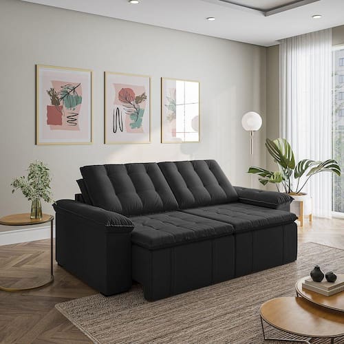 Sofá Cama Palmeira 3 Lugares Retrátil Reclinável 220cm Veludo CabeCasa MadeiraMadeira Preto