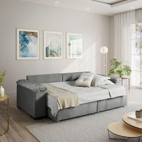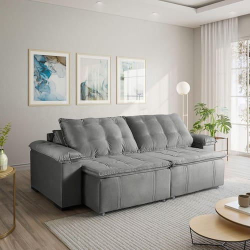 O Sofá Cama Palmeira MadeiraMadeira é a solução perfeita para quem tem pouco espaço disponível. Com ele você poderá acomodar suas visitas com conforto e praticidade. Produzido em madeira maciça de eucalipto, com as seguintes medidas (A x L x P): 103cm x 220cm x 112cm. Depois nos conte como foi a experiência de compra e como ficou seu ambiente nos comentários! Acompanha Almofadas extras: Não Almofada do assento: Fixa Almofada do encosto: Removível Altura do assento até o chão: 48 cm Altura do Encosto: 58 cm Altura dos Pés: 4 cm Ambiente Principal: Sala de Estar Complexidade da Montagem: Baixa: pode ser montado por uma pessoa sozinha Cor: Cinza Cor do Produto: Cinza Densidade do Assento: D-24 Densidade do Encosto: Camadas de Densidades Diferentes Enchimento do Assento: Espuma Enchimento do Encosto: Fibra Siliconada Estilo de Braço: Braços Pillow Top Firmeza do Assento: Macio Itens Inclusos: 1 Sofá, Acessórios e Instrução de Montagem Linha ou Coleção: Palmeira Manual de Montagem e Instalação: https://cdn2.madeiramadeira.com.br/atributo/takei-estofados/832464-sof-cama-palmeira-slim-v-01.pdf Material dos Pés: Madeira Necessita Montagem: Sim Origem do Produto: Nacional Peso: 77 kg Pet Friendly: Não Possui Percintas Elásticas: Sim Possui Pés: 08 Possui Rodízio: Sim Profundidade Quando Estendido: 148 cm Recomendações de Uso, Manutenção e Limpeza: Evitar exposição direta à luz solar, limpar com escova macia e aspirar o pó semanalmente, não utilizar produtos químicos, removedores, alvejantes, etc. Evite exercer pressão excessiva sobre determinada partes do estofado, não utilizar para limpeza equipamentos a vapor de água. Rodízio com Trava: Não Sistema de Montagem: Parafusos Suporta Até (kg): 200 kg Tecido Predominante: Veludo Tipo de Encosto: Regulável Tipo de Mola: Molas Bonnel