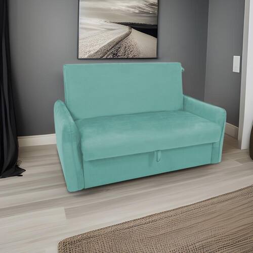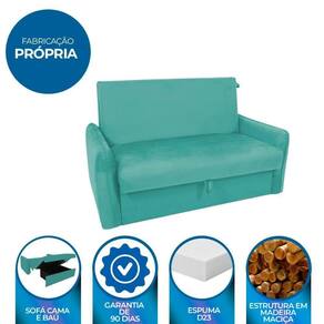 Produto: Sofá Zaia | Conteúdo da Embalagem: Sofá Cama Zaia | Nome do Simples no Fornecedor: Sofá Cama para Sala de Estar Zaia com Baú Veludo Chumbo | Altura do Produto (cm): 88 | Largura do Produto (cm): 136 | Comprimento do Produto (cm): 93 | Altura do Produto com embalagem (cm): 90 | Largura do Produto com embalagem (cm): 138 | Comprimento do Produto com embalagem (cm): 95 | Descrição do Tamanho: 90x138x95 cm | Peso do Produto com embalagem (Kg): 51 | Peso do Produto (Kg): 50 | Material da Estrutura: Madeira Maciça | Material para Filtro: Madeira | Instruções/Cuidados: Não deixe o móvel exposto ao sol. Evite contato com líquidos. | Estado de Origem: PR | Garantia do Fabricante: 3 meses contra defeitos de fabricação. Não cobrimos alterações e/ou montagem errada. | Garantia em Meses: 3 | Fabricado Por: Matrix | Vendido Por: Zanin Shop | Cômodo Indicado: Sala de Estar | Possui Pés: Sim | Volumes: 1 | Medidas Aberto: 40 X 136 X 180 cm | Medidas do Encosto: 47 X 114 X 59 cm | Medida do Assento: 50 X 114 X 59 cm | Medidas Braças: 53 X 12 X 84 cm | Peso Suportado: 100 Kg | Revestimento: Tecido Veludo | Material dos Pés: Polipropileno | Tipo de produto: Sofá | Medidas do Baú: 23x74x48 cm | Largura Produto Com Embalagem (cm): 138 Cor: Verde Agua