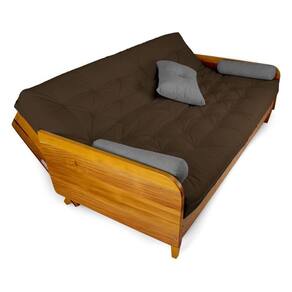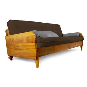 1 futon 130cm x 190 cm x 16 cm, 2 almofadas cone, 1 almofada quadrada, 1 sofá de madeira grápia.