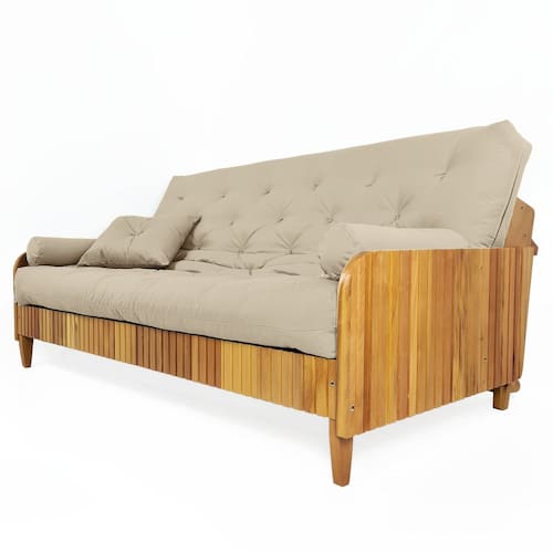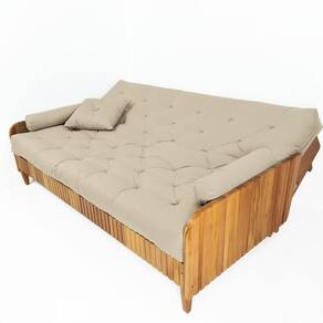 Sofá 4 Lugares Ripado de Madeira Maciça Nobre O Futon Paris em Tecido Sarja com 3 Almofadas Esse modelo inspirado em uma tendência oriental é uma peça versátil, que agrega conforto a diversos estilos de decoração. O modelo Paris é adaptável, podendo ser configurado como sofá de 4 lugares, espreguiçadeira e cama. Produto não indicado para uso em área externa sem cobertura. Medidas como sofá: Largura: 190 cm - Profundidade interna: 65 cm - Altura do assento: 42 cm. Medidas como cama: Largura: 190 cm – Profundidade: 130 cm. Origem do produto: Nacional Peso do produto: 40 kg. Peso suportado: 400 kg. Itens inclusos: 1 futon de 130 cm x 190 cm x 16 cm 2 almofadas cone 1 almofada quadrada 1 sofá de madeira maciça nobre de grápia Material e Estrutura: O colchão futon casal é confeccionado em tecido de sarja, com enchimento de mantas de algodão natural e fibra siliconada, estruturado com espuma ortopédica D28. Conta com amarras nas extremidades. A estrutura é feita em madeira maciça nobre ripado natural Importante saber: Antes de finalizar sua compra, confira as medidas e características do produto para garantir que está de acordo com o espaço e com suas expectativas. Certifique-se de que o item poderá passar por elevadores, portas, escadas, corredores ou locais de difícil acesso até o local desejado. Montagem: O serviço de montagem não está incluso. Produtos entregues desmontados possuem manual de montagem com instruções detalhadas. A montagem é simples e pode ser feita de forma independente ou com ajuda de um profissional. Ferramentas necessárias para a montagem: Chave de fenda e chave de boca de 11 mm. Instruções de limpeza: Use flanela ou pano macio para a limpeza. Evite produtos abrasivos ou corrosivos; caso necessário, um pano levemente umedecido em água e escova de cerdas macias são indicados. Medidas do produto embalado para entrega: 1 volume: 2,0 m x 0,65 m x 0,18 m 1 volume: 1,35 m x 0,63 m x 0,29 m 1 volume: 1,9 m x 0,20 m x 0,57 m