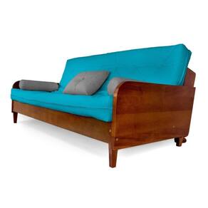 1 futon 130cm x 190 cm x 16 cm, 2 almofadas cone, 1 almofada quadrada, 1 sofá de madeira grápia.