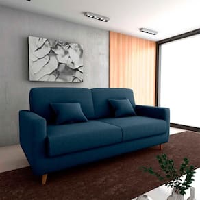 Acompanha duas almofadas decorativas de 35x35 cm que agregam charme e conforto extra ao ambiente. Ideal para salas, escritórios ou quartos de hóspedes, acomoda até 3 pessoas como sofá e 2 como cama.
