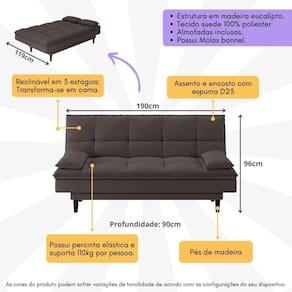O Sofá Cama Reclinável com 2 Almofadas Inclusas Multimóveis CR45238 é uma combinação de elegância, conforto e funcionalidade para a sua casa. Este sofá-cama possui estrutura produzida em madeira eucalipto, garantindo durabilidade e estabilidade para uso prolongado. Revestido com tecido suede 100% poliéster, este sofá oferece uma sensação suave e luxuosa ao toque, adicionando um toque de sofisticação ao seu ambiente. Seu assento e encosto são preenchidos com espuma D23, proporcionando um conforto excepcional para momentos de relaxamento. Além disso, as molas bonnel e a percinta elástica proporcionam um suporte firme e ergonômico, enquanto sua capacidade de suportar até 120kg por pessoa garante segurança e conforto para todos os usuários. Com a capacidade de reclinamento em 3 estágios, este sofá transforma-se facilmente em uma cama espaçosa, oferecendo uma solução prática para acomodar visitantes durante a noite. E para maior comodidade, incluímos duas almofadas que podem ser utilizadas como travesseiros após a transformação em cama. Os pés de 15cm em madeira complementam o design elegante deste sofá, adicionando um toque de estilo e estabilidade.