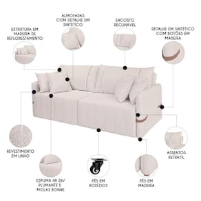 Revestido com o mais fino linho, oferece uma textura suave ao toque, enquanto os detalhes em sintético nos braços adicionam um toque de sofisticação. Os botões de madeira cuidadosamente inseridos destacam-se, proporcionando um visual clássico e atemporal. Para garantir o máximo conforto em sua Sala De Estar, este Sofá 2 Lugares acompanha almofadas e encosto com plumante, percintas elásticas e molas Bonnell, que juntas criam uma experiência de assento e sono excepcional. Os pés 3cm em madeira cor mel não só reforçam a robustez da estrutura, mas também complementam o design com sua beleza natural. Ah! Além de tudo, esse Sofá Retrátil possui rodízios em silicone facilitando a abertura. Ideal para quem busca praticidade sem abrir mão do estilo, este sofá-cama é uma adição luxuosa a qualquer ambiente.