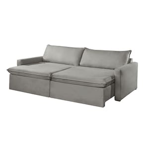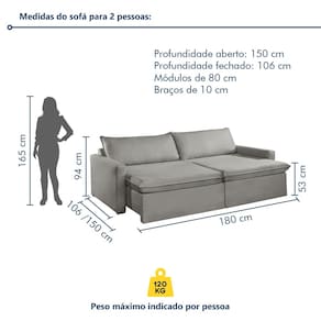 Este sofá cama acomoda quantas pessoas? Acomoda confortavelmente até três pessoas no modo sofá e duas no modo cama. Largura (cm): 180 Possui Pés: 08 Pet Friendly: Não Tipo de Mola: Mola Espiral Altura dos Pés: 2.5 Modelo do Sofá: Retrátil e Reclinável Possui Rodízio: Sim Suporta Até (kg): 120 Profundidade (cm): 106 Tipo de Encosto: Regulável Material dos Pés: Madeira Altura do Encosto: 57 Nível de Conforto: Macio Origem do Produto: Nacional Rodízio com Trava: Não Ambiente Principal: Sala de Estar Necessita Montagem: Sim Resistente à Chuva: Não Densidade do Assento: D-28 Densidade do Encosto: D-18 Enchimento do Assento: Hyper Soft Enchimento do Encosto: Fibra Siliconada Quantidade de Lugares: 02 Complexidade da Montagem: Baixa: pode ser montado por uma pessoa sozinha Serviço Impermeabilização: 102610509 Acompanha Almofadas Extras: Não Possui Percintas Elásticas: Sim Altura do Assento até o Chão: 53 Profundidade Quando Estendido: 150 Recomendações de Uso, Manutenção e Limpeza: A limpeza do revestimento deve ser feita com escova ou tecido de algodão branco levemente umedecidos em água morna, sabão neutro ou produto específico. Não usar produtos corrosivos nem a base de solventes, como: cloro, alvejantes, detergentes, entre outros;Não expor o estofado à luz direta. Mantenha portas e janelas sempre protegidas com cortinas e blackout. A exposição contínua à radiação da luz, danifica o revestimento, apodrecendo os fios, trincando a superfície e desbotando as cores;Não lavar o revestimento das almofadas pois pode desfiá-las, abrindo as costuras;Não utilizar o estofado para fins diferentes do que foi projetado: ficar em pé, pular, arrastar, sentar nos braços, peso na caixa traseira, entre outros tipos de ações que poderão danificar o produto. Marca: Montano Estofados Cor do Produto: Cinza Itens Inclusos: 1 Sofá, 1 Kit Ferragens, 1 Manual de Montagem Sistema de Montagem: Sim