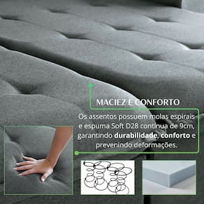 O assento é retrátil que permite você utilizar o sofá com as pernas esticadas e ter todo o conforto que ele possa te proporcionar. Além disso, sua estrutura é composta por madeira 100% reflorestada,