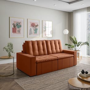 O Sofá Cama Palmeira MadeiraMadeira é a solução perfeita para quem tem pouco espaço disponível. Com ele você poderá acomodar suas visitas com conforto e praticidade. Produzido em madeira maciça de eucalipto, suporta até 400kg. Depois nos conte como foi a experiência de compra e como ficou seu ambiente nos comentários! Acompanha Almofadas extras: Não Almofada do assento: Fixa Almofada do encosto: Removível Altura do assento até o chão: 48 Altura do Encosto: 58 Altura dos Pés: 3 Ambiente Principal: Sala de Estar Complexidade da Montagem: Baixa: pode ser montado por uma pessoa sozinha Cor: Terracota Cor do Produto: Terracota Densidade do Assento: D-23 Densidade do Encosto: Camadas de Densidades Diferentes Enchimento do Assento: Espuma Enchimento do Encosto: Fibra Siliconada Estilo de Braço: Braços Quadrados Firmeza do Assento: Médio Informações Complementares: Densidade Braço D19. Enchimento do encosto: fibra siliconada com flocos de espuma envolvidas com manta siliconada. Itens Inclusos: Sofá, 8 pés e Manual de Montagem Linha ou Coleção: Palmeira Manual de Montagem e Instalação: https://product-hub-prd.madeiramadeira.com.br/877879/documents/ed8c3227-a77e-4862-8e5f-f215ea2d3c7anualSofCamaPalmeiraSlimalt.pdf Material dos Pés: Polimero Necessita Montagem: Sim Nível de Conforto: Macio Origem do Produto: Nacional Peso: 89 Pet Friendly: Não Possui Entrada USB: Não Possui Percintas Elásticas: Sim Possui Pés: 08 Possui Rodízio: Sim Profundidade Quando Estendido: 148 Recomendações de Uso, Manutenção e Limpeza: Evitar exposição direta à luz solar, limpar com escova macia e aspirar o pó semanalmente, não utilizar produtos químicos, removedores, alvejantes, etc. Evite exercer pressão excessiva sobre determinada partes do estofado, não utilizar para limpeza equipamentos a vapor de água. Resistente à Chuva: Não Revestimento do Braço: Veludo Rodízio com Trava: Não Sistema de Montagem: Parafusos e Engates Suporta Até (kg): 200 Tecido Predominante: Veludo Tipo de Encosto: Regulável Tipo de Mola: Molas Bonnel Ean: 7909903474785
