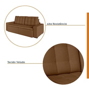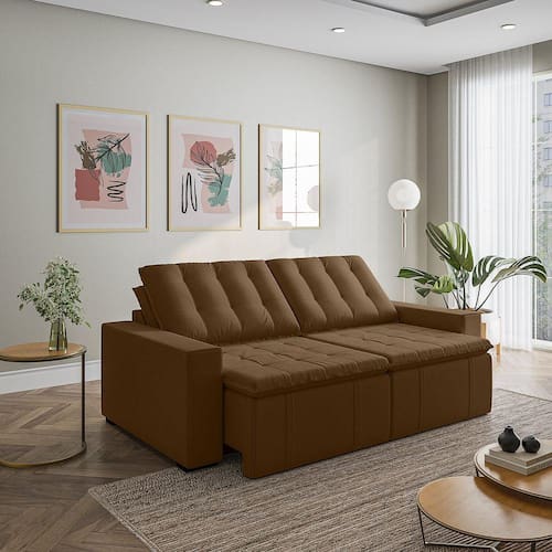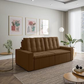 O Sofá Cama Palmeira MadeiraMadeira é a solução perfeita para quem tem pouco espaço disponível. Com ele você poderá acomodar suas visitas com conforto e praticidade. Produzido em madeira maciça de eucalipto, suporta até 400kg. Depois nos conte como foi a experiência de compra e como ficou seu ambiente nos comentários! Acompanha Almofadas extras: Não Almofada do assento: Fixa Almofada do encosto: Removível Altura do assento até o chão: 48 Altura do Encosto: 58 Altura dos Pés: 3 Ambiente Principal: Sala de Estar Complexidade da Montagem: Baixa: pode ser montado por uma pessoa sozinha Cor: Castor Cor do Produto: Castor Densidade do Assento: D-23 Densidade do Encosto: Camadas de Densidades Diferentes Enchimento do Assento: Espuma Enchimento do Encosto: Fibra Siliconada Estilo de Braço: Braços Quadrados Firmeza do Assento: Médio Informações Complementares: Densidade Braço D19. Enchimento do encosto: fibra siliconada com flocos de espuma envolvidas com manta siliconada. Itens Inclusos: 1 Sofá, Kit Ferragens e Manual de Montagem Linha ou Coleção: Palmeira Manual de Montagem e Instalação: https://product-hub-prd.madeiramadeira.com.br/879725/documents/70117715-75e8-48a6-8d60-483629a653a7palmeira240260280bracoreto.pdf Material dos Pés: Polimero Modelo: Retrátil e Reclinável Necessita Montagem: Sim Nível de Conforto: Macio Origem do Produto: Nacional Peso: 87 Pet Friendly: Não Possui Entrada USB: Não Possui Percintas Elásticas: Sim Possui Pés: 08 Possui Rodízio: Sim Profundidade Quando Estendido: 148 Recomendações de Uso, Manutenção e Limpeza: Evitar exposição direta à luz solar, limpar com escova macia e aspirar o pó semanalmente, não utilizar produtos químicos, removedores, alvejantes, etc. Evite exercer pressão excessiva sobre determinada partes do estofado, não utilizar para limpeza equipamentos a vapor de água. Resistente à Chuva: Não Revestimento do Braço: Veludo Rodízio com Trava: Não Sistema de Montagem: Parafusos e Engates Tecido Predominante: Veludo Tipo de Encosto: Regulável Tipo de Mola: Molas Bonnel